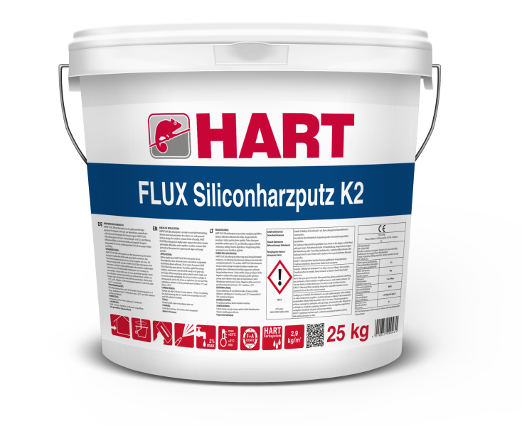 Silikoninis dekoratyvinis grūdėtos faktūros tinkas HART FLUX Siliconharzputz yra elastingas, plastiškas, atsparus atmosferos poveikiui, laidus vandens garams ir CO2. Specialūs FA priedai saugo nuo dumblių, samanų, kerpių, grybelio atsiradimo. HART FLUX Siliconharzputz tonuojamas pigmentuojamas atsparia ultravioletiniams spinduliams sistema „HART Farbsystem".